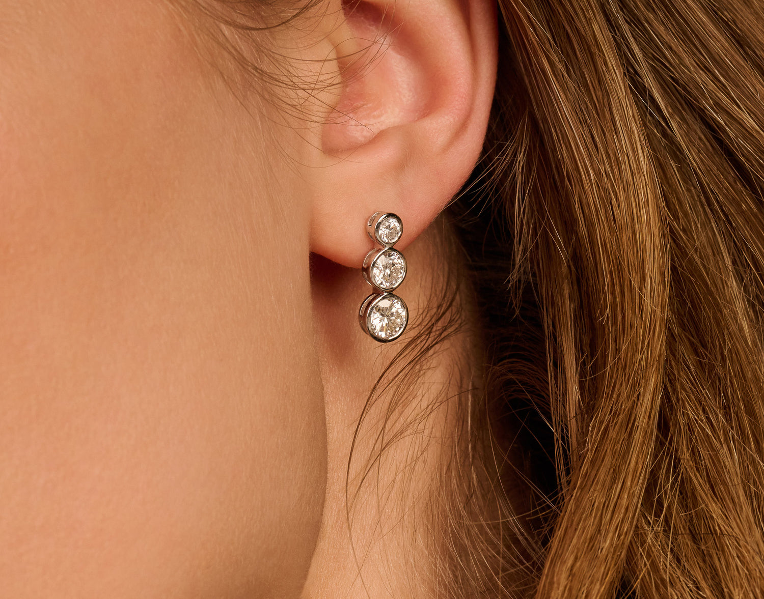 Deze bezel trio oorbellen zijn uitgevoerd in massief 14k witgoud en gezet met drie lab-grown diamanten per oorbel, zorgvuldig opgebouwd in formaat voor een natuurlijke, vloeiende uitstraling. De grootste steen van circa 0,65 ct vormt het middelpunt, gevolgd door een steen van ongeveer 0,44 ct en een subtiele afronding met een steen van circa 0,16 ct. Samen goed voor ongeveer 2,5 ct totale schittering.