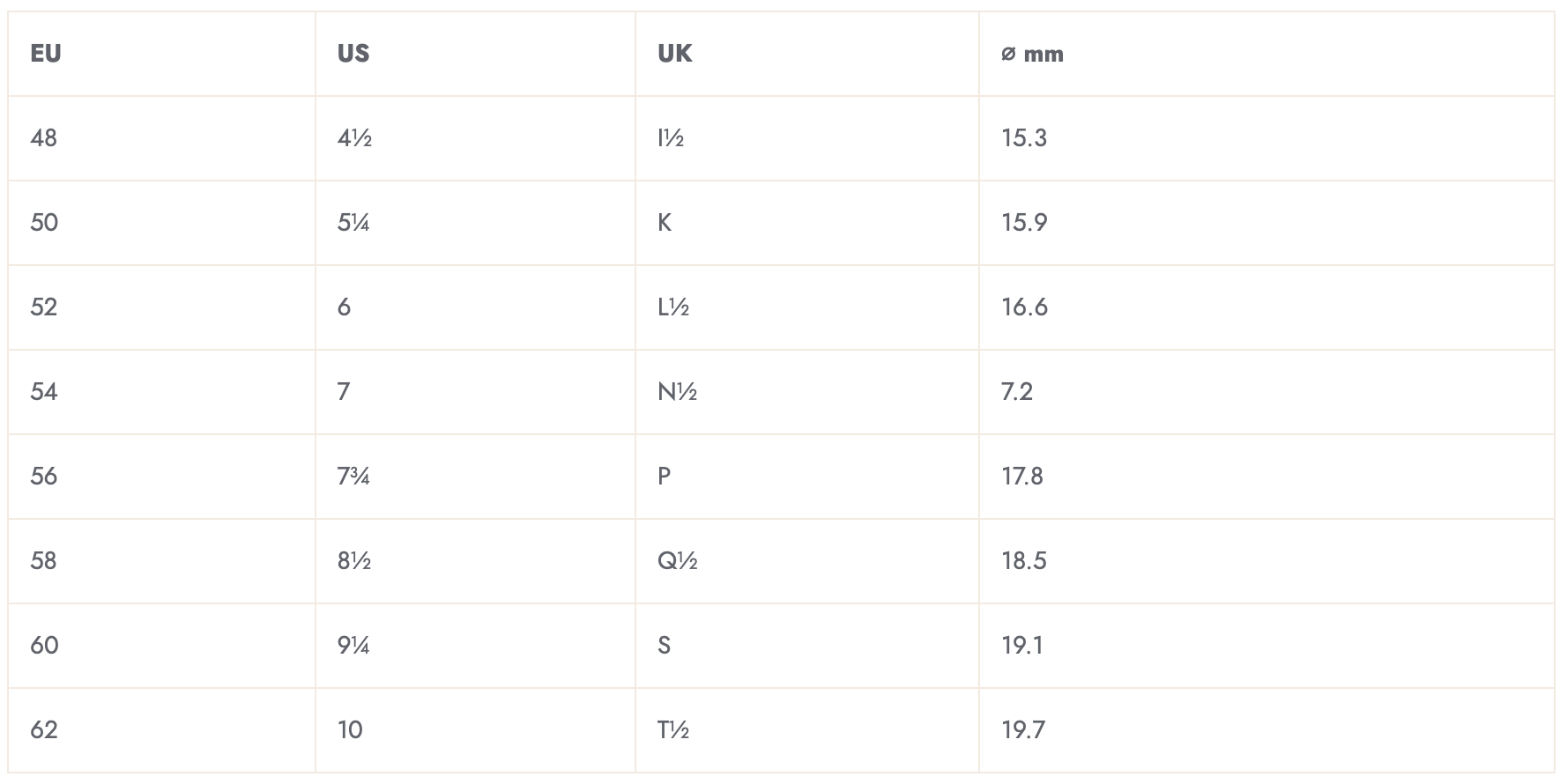 Deze lengte staat gelijk aan de omtrek van je vinger. Let ook hier op dat bredere ringen je net iets ruimer moet kiezen. bij de maatkeuze in jouw winkelmand vind je vervolgens jouw maat.